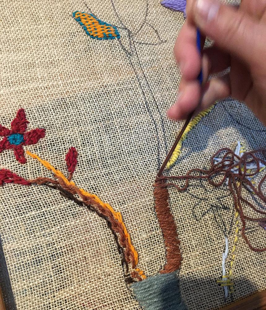 Made from recycled materials, The tree of life project involved visitors to the gallery contributing elements of the tree, drawn in wool to make up the components of a single work. Sadly restrictions to public programming due to covid meant that the work was not fully completed, so I am thrilled that CHS knitting club are now in the process of completing the project.