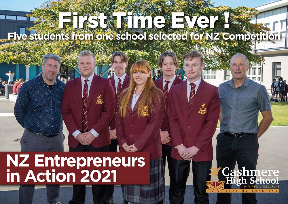 For the first time ever, a New Zealand secondary school has five students selected to attend the National Business Competition ‘Entrepreneurs in Action.’ This is a Young Enterprise competition that sees 78 students from across the country compete in newly formed teams over a 48 hour period. The students are paired up with one of the thirteen company hosts such as Air New Zealand, Xero, Sharesies amongst others and are given an industry challenge to solve. They have a day to research, ideate and present their solution to a panel of judges, and there are two challenges during the weekend! Cashmere Alumni Eddie Hogan and Eva Thornley were part of the winning teams in 2019 and 2020 respectively.