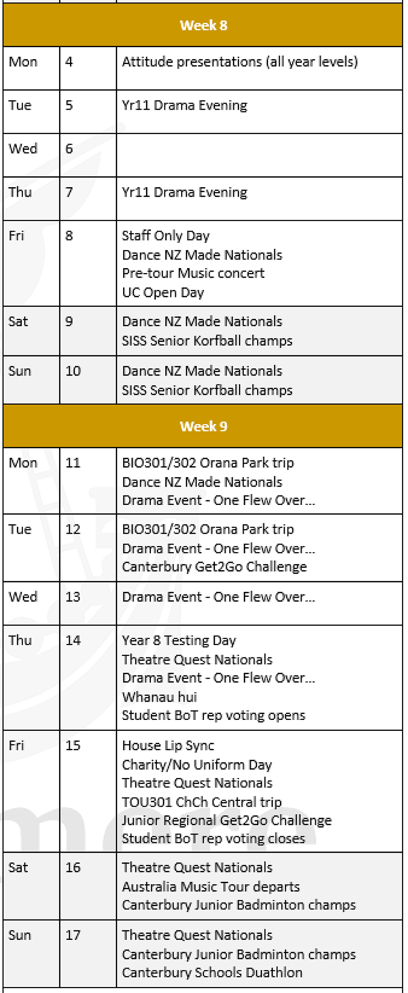 On Thursday in week 9 (14th September) we have Year 8's coming in to complete their entrance testing. As usual, to accommodate the testing, our Year 9 students will be rostered home for P1-3 on this morning and will only come to school for P4 and P5.