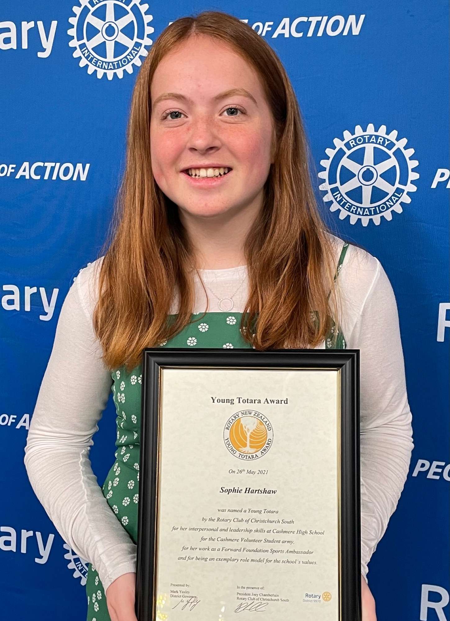 Earlier this year, Sophie Hartshaw was nominated for a Young Totara Award - 'Service beyond Self'