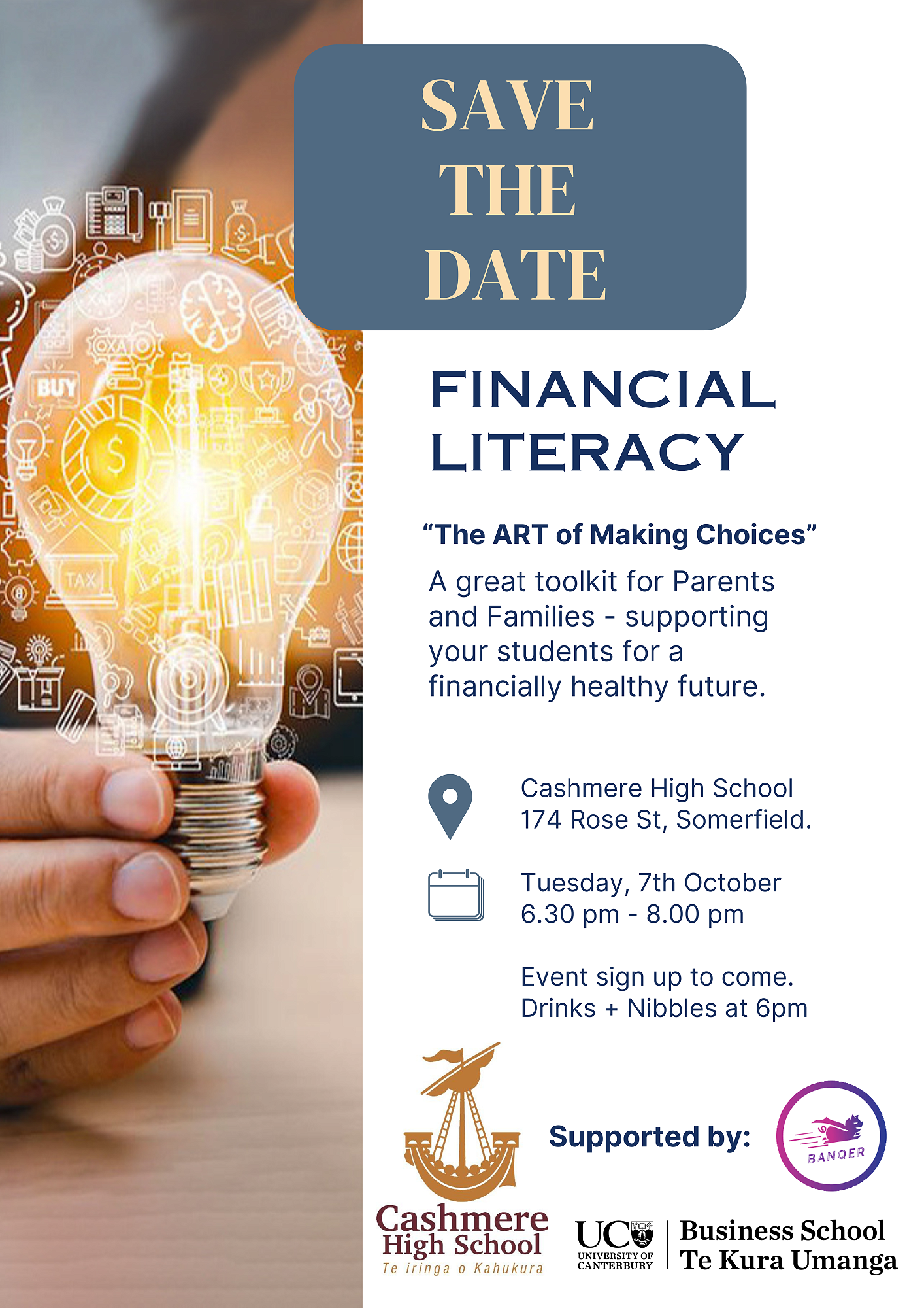 A great toolkit for Parents and Families, supporting your students for a financially healthy future. Starting with drinks & nibbles served at 6.00pm in the Performing Arts Centre Foyer, come along to learn just what Financial literacy is. How do Commerce subjects in Cashmere link to Financial Literacy? Together with Rasha Magdy and Matt Benassi from the Cashmere High Commerce Faculty, we have 3 Professors and Lecturers from the University of Canterbury Business School, and a Cashmere High School Alumnus running a successful business presenting. They will share and also answer questions to help parents gain knowledge and tools not only for themselves but to support their whānau.