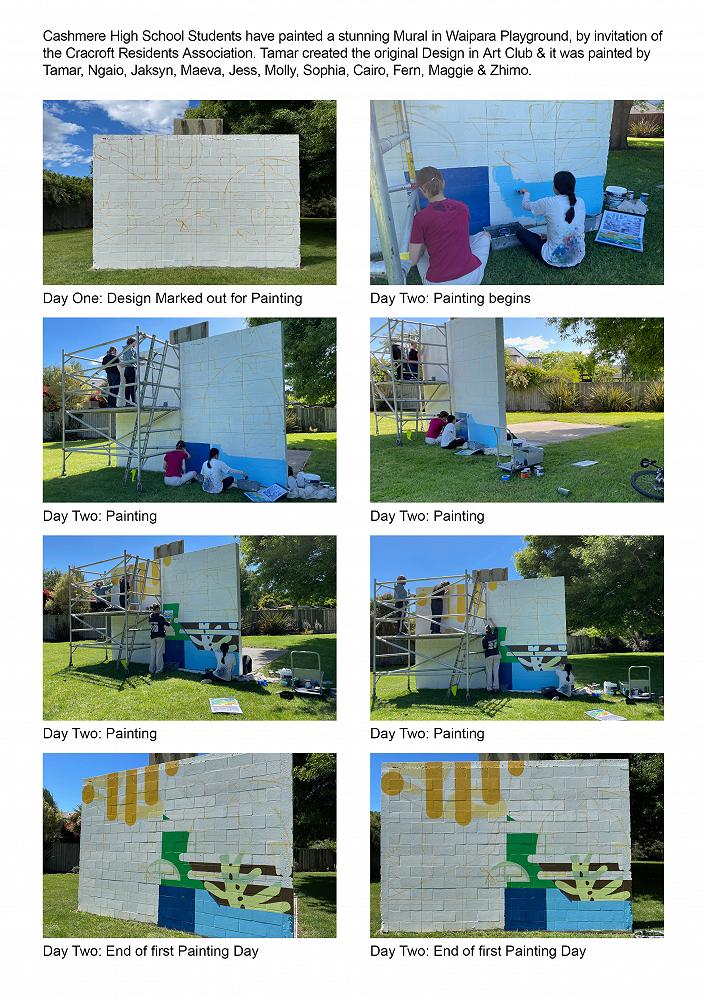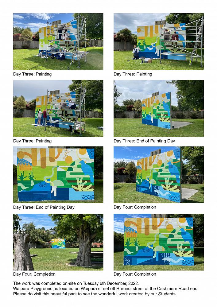 This fantastic Mural was completed at the very end of Term 4. We were invited by Cracroft Residents Association to submit designs to replace a mural which had been on the site in Waipara Playground for nearly 17 years! Art Club students sprung into action producing a number of wonderful ideas. The residents chose this beautiful design by Year 10 student Tamar. The mural was completed by Tamar, Ngaio, Jaksyn, Maeva, Jess, Molly, Sophia, Cairo, Fern, Maggie & Zhimo over a period of 4 days with our amazing property team supplying scaffolding each day. The images below show the development of the work.