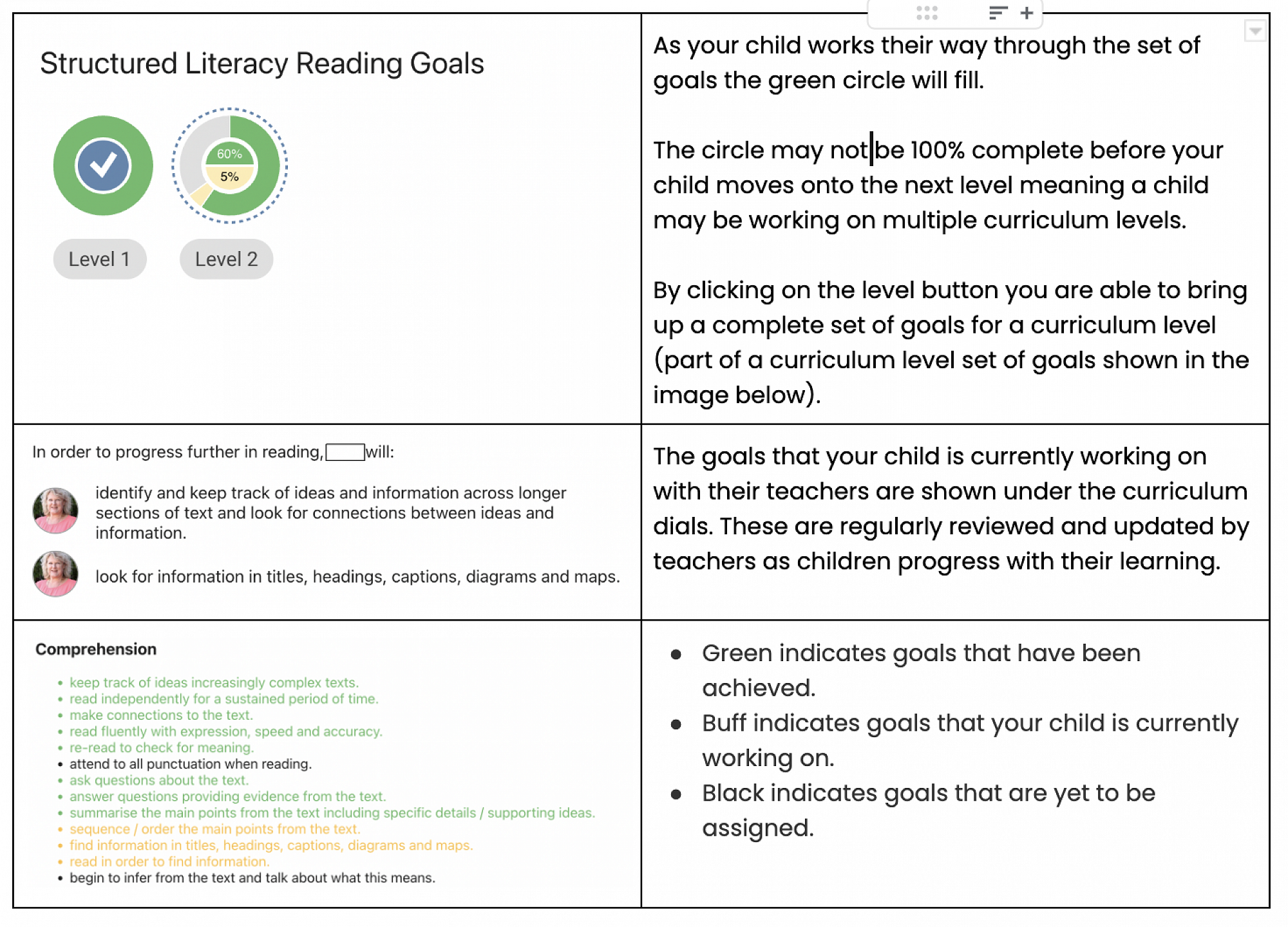 The goals that your child is currently working on with their teachers are shown under the curriculum dials. These are regularly reviewed and updated by teachers as children progress with their learning.