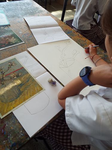The Year 6 classes are exploring the techniques and colours used in the Expressionist Movement with a focus on van Gogh flower and landscape paintings. Each child has chosen a different painting to work with. They are learning about enlarging a picture and how to apply oil paint sticks to create texture as well as mixing, blending and tinting colours.
