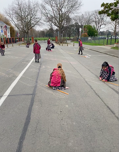 The girls observed the direction and length of their shadows at various times throughout the day. They drew around their partners’ shadows at 9.00 am then measured and recorded this data on a chart in a Google Sheet. They repeated the measurements at 2.30 pm (when, thankfully, the Sun appeared through a break in the clouds), recording the data on the same chart.