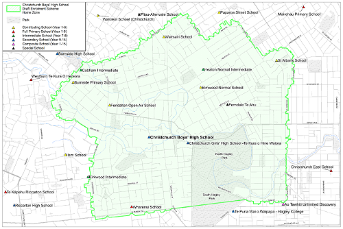 All residential properties on or within the boundary of streets described above shall be in-zone addresses for the purpose of an in-zone enrolment to Christchurch Boys’ High School.