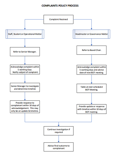 Board members are available to receive concerns and comment about the School from any source but shall redirect that concern or complaint in the first instance to the Headmaster (or Board Chair if concerning the Headmaster) for action.The Board recognises that not all complainants will be satisfied with the outcome of the investigation into their complaint. Once reconsidered, if the Board is confident of its decision, it may refuse to enter into any further discussion/correspondence regarding the complaint.