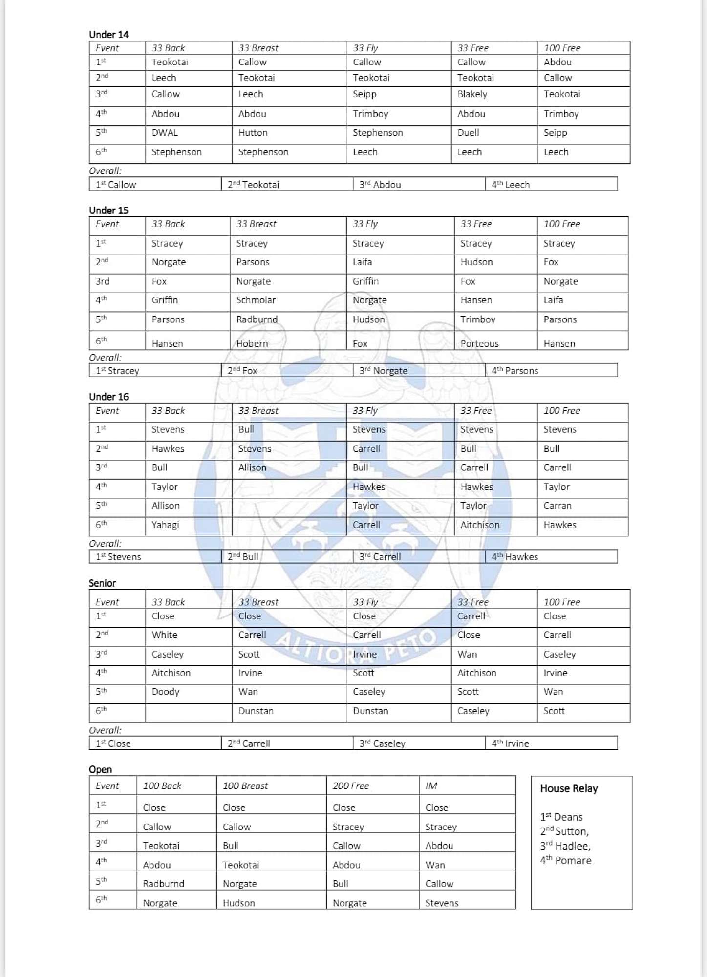 Swimming Sports Results :