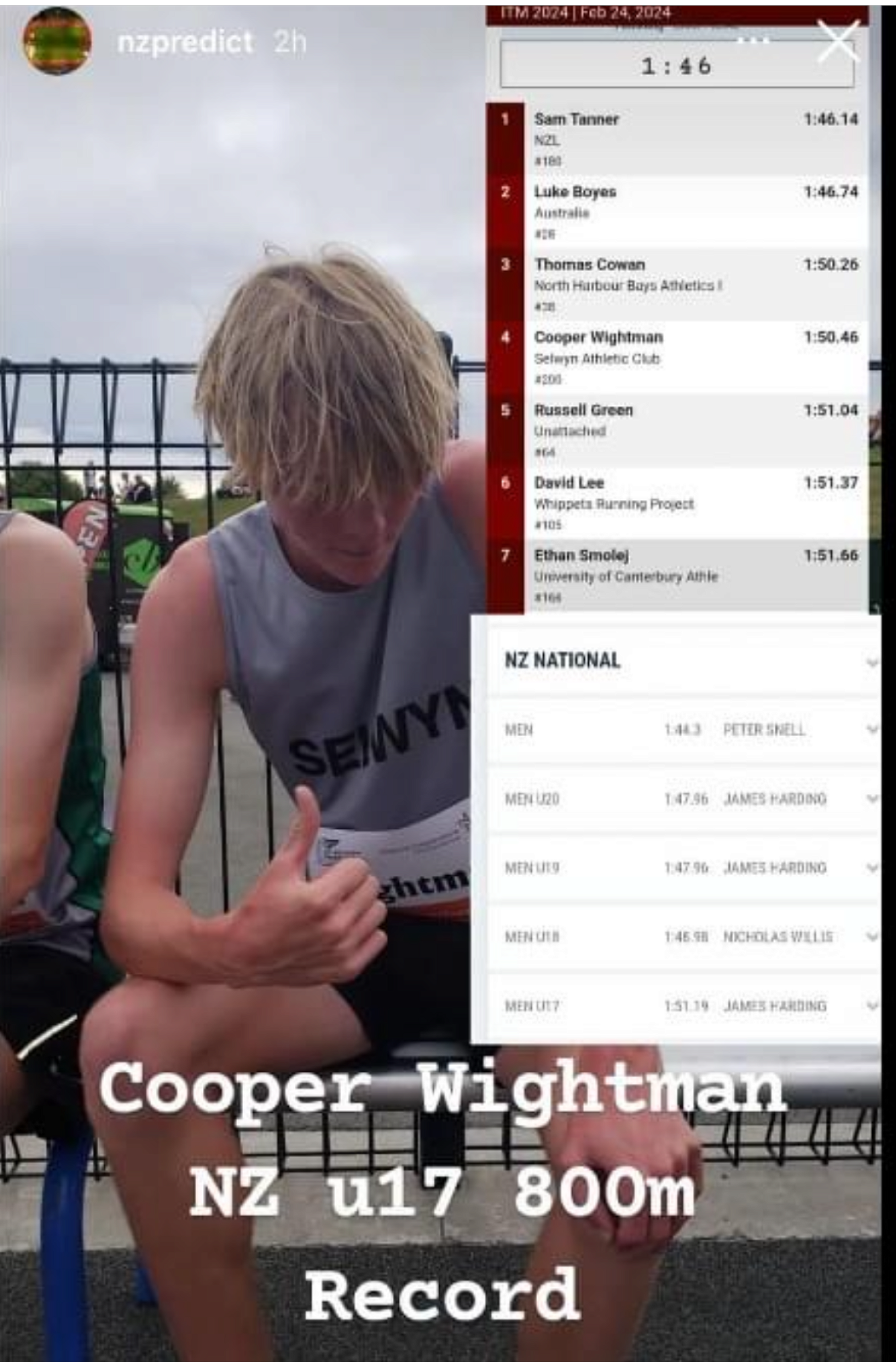 Cooper Wightman continues his golden form breaking the NZ U17 800m record. Cooper ran the race in a time of 1.50.46, just under one second away for qualifying for the World Junior Championships. Despite breaking the NZ record and going under the world athletics time, this is not deemed fast enough by NZ Athletics. He has however already qualified for the 1500m at this event.
