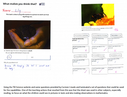 Using the TKI Science website and some questions provided by Carmen I made and laminated a set of questions that could be used for the capabilities. One of the teaching actions that resulted from this was that the sheet was used in other subjects, especially reading, to focus on what the children could see in pictures in texts and also making observations in mathematics.