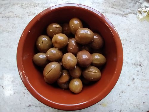 I sometimes have two large bowls on my bench at a time as I don’t mix varieties. This is not a chore. It is a delight. Taste an olive occasionally to test for bitterness. You will know when they taste like an olive.