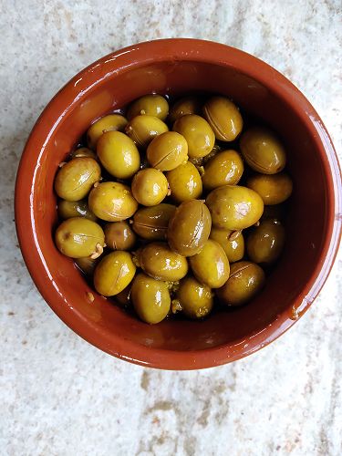 Put olives in sterilized bottles. Don’t fill too much as you need a gap at the top. Pop a bay leaf, some fennel seeds, a garlic clove, a small chilli and a couple of slices of lemon, artfully arranged around the edge, any of the above or just leave it plain. I have been known to put in too much chilli. Pour over the 8% brine solution, add about ½ teaspoon of white vinegar and top with a generous slug of olive oil. This is very important as it seals the olives and prevents any growth of mould.