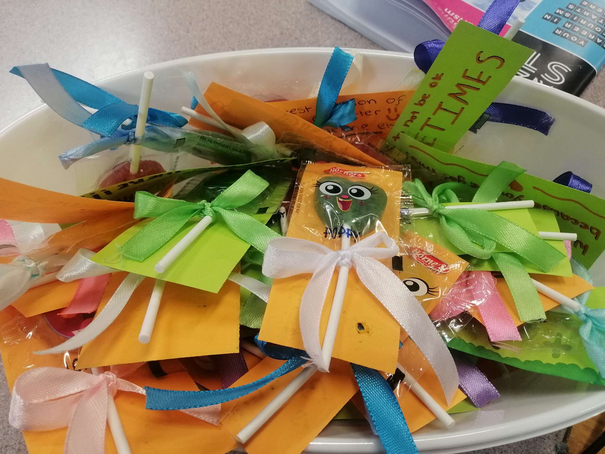 Students were happy to get lollipops and inspiring notes to spread among their friends and families.
