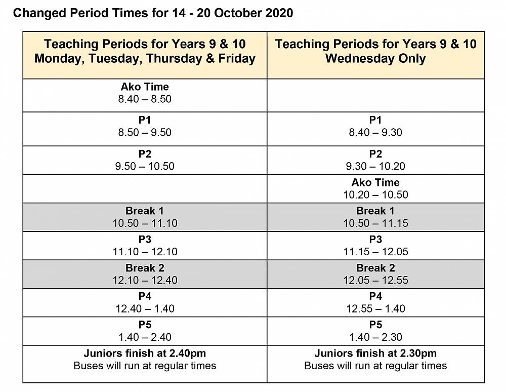 - To accommodate the examinations we amend the period times slightly. The period and finishing times for the duration of the examinations will be: