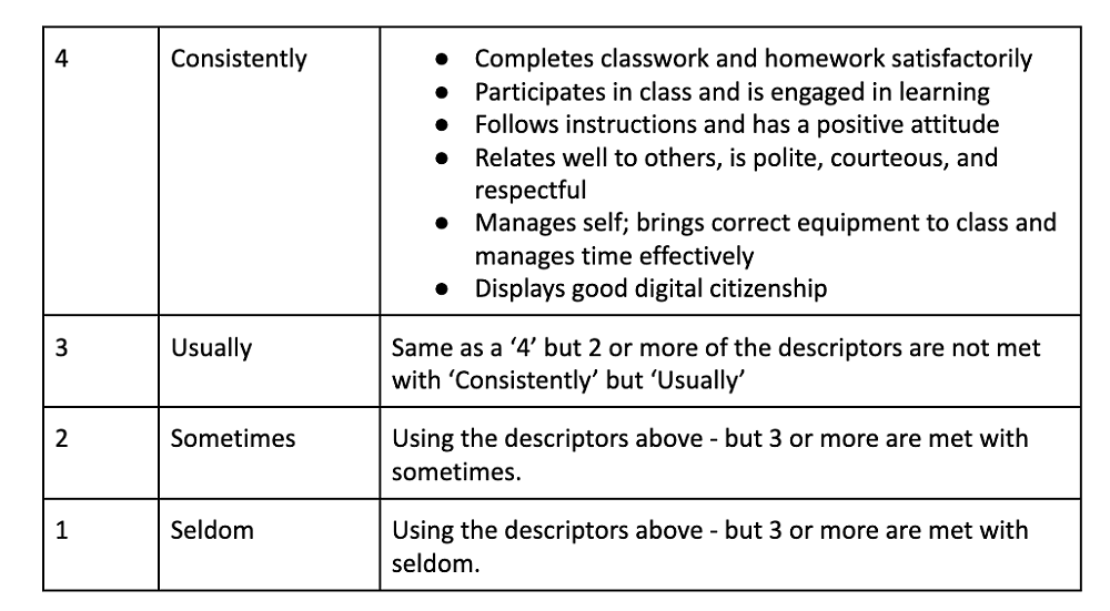We expect students to be receiving a 4, indicating that they are consistently meeting the criteria below. These descriptors are aligned with the Key Competencies in the New Zealand Curriculum and are deemed essential for effective learning.