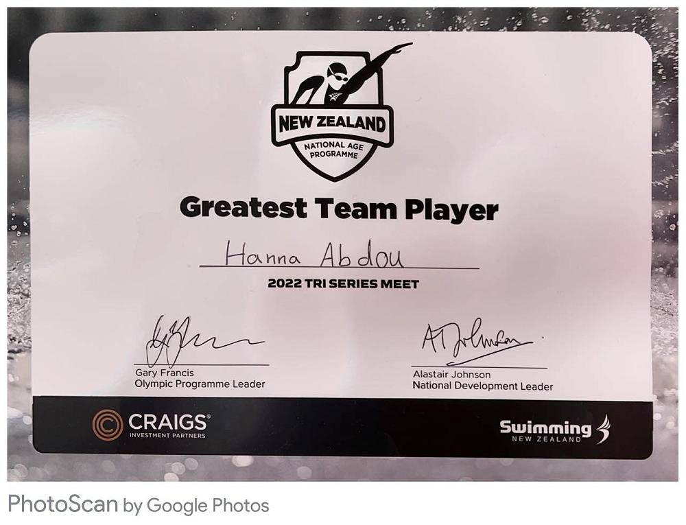 Also, during the school holidays, Hanna was selected for the NZ Age Group National Programme and Tri Series competition which was held in Christchurch at the Selwyn Aquatic Centre. It was a great experience to join the elite swimmers from all over NZ and on the final day she was selected as the best team player in her team.