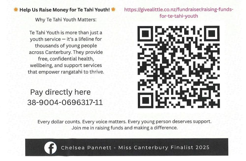 A poster is on display with a link to donate to Te Tahi Youth and information about the important work they do to support young people.