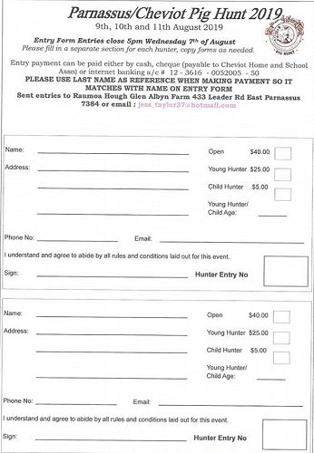 On the 9th 10th and 11th of August we will be holding our annual pig hunt and we would love to have your support for this event. Weigh in is on Sunday the 11th of August and we will have an obstacle course running for the kids from 1 - 2.30 and also a BBQ from 12 onwards. As this is Home and Schools biggest fundraiser your attendance will be much appreciated and will aid in our goal of replacing our existing playground.