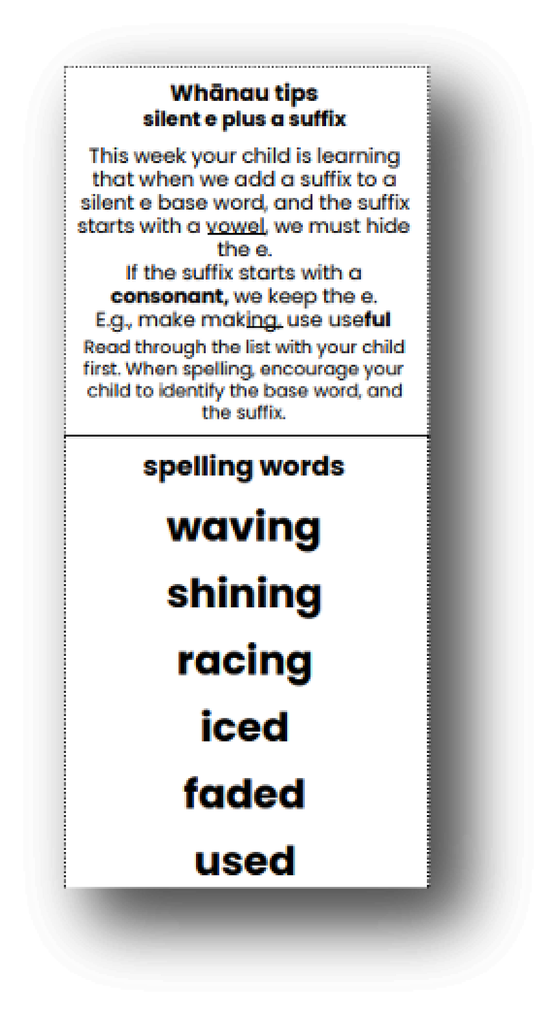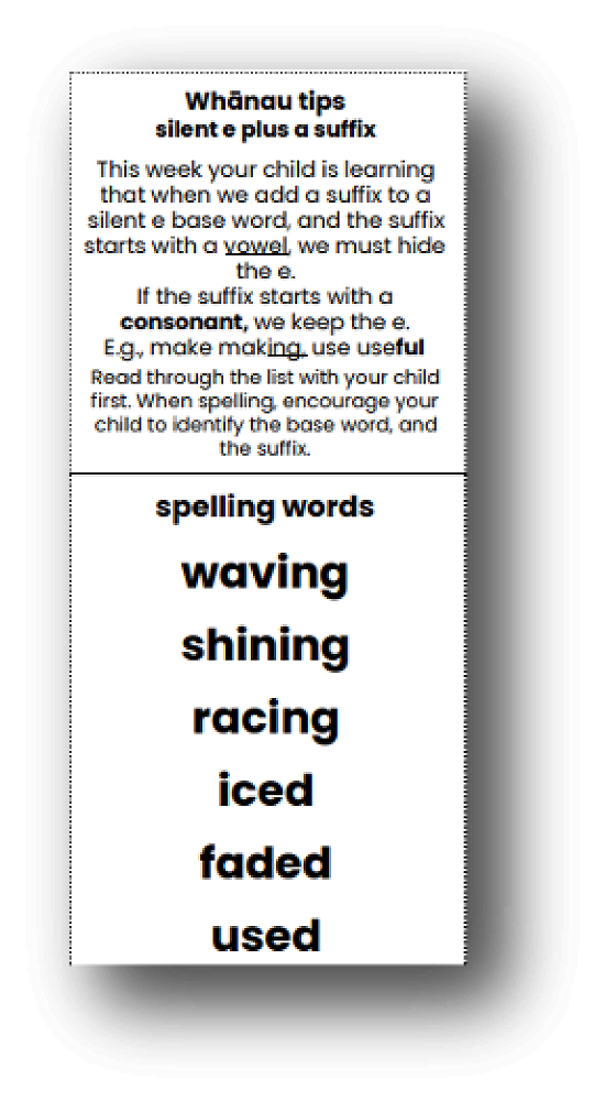- We will be implementing a very explicit approach to the teaching of spelling. You will notice a much more systematic sequence to the practising of spelling words. Here is an example of a whānau tip that teachers may, in time, send home to help you understand and support the learning of the spelling concept that your child is practising.