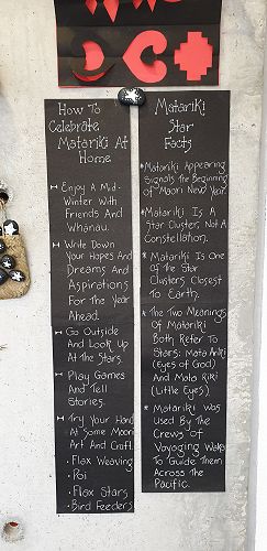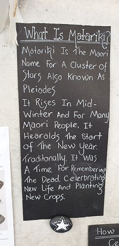 Matariki is the Maori name for a cluster of stars also know as Pleiades. They rise in mid winter, and for many Maori people it heralds the start of the Maori New Year. Traditionally it was a time for remembering the dead, celebrating new life and planting new crops.