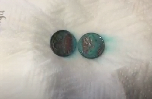 Half a hour later from that the colour changed to a pinky white colour with a stronger smell, then a hour later the coins turned into a cyan turquoise colour and the smell disappeared. One hour later the turquoise colour spread thickly and it felt a bit greasy.