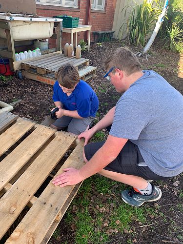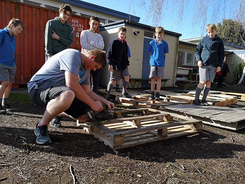 Over two Wednesday afternoons, the Burnside Enviro Club helped us to build three raised beds from pallets.