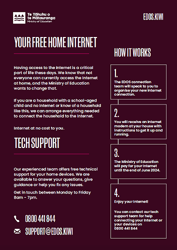 Manaiakalani Education Trust and the Ministry of Education are continuing to work together to sort out free home internet connections for any household with school-age children who don’t have it. The Ministry of Education is paying for the installation and monthly costs until 30 June 2024, and is working on the solution for beyond (there is no obligation on families to take it up). Please see the attached information for more details.