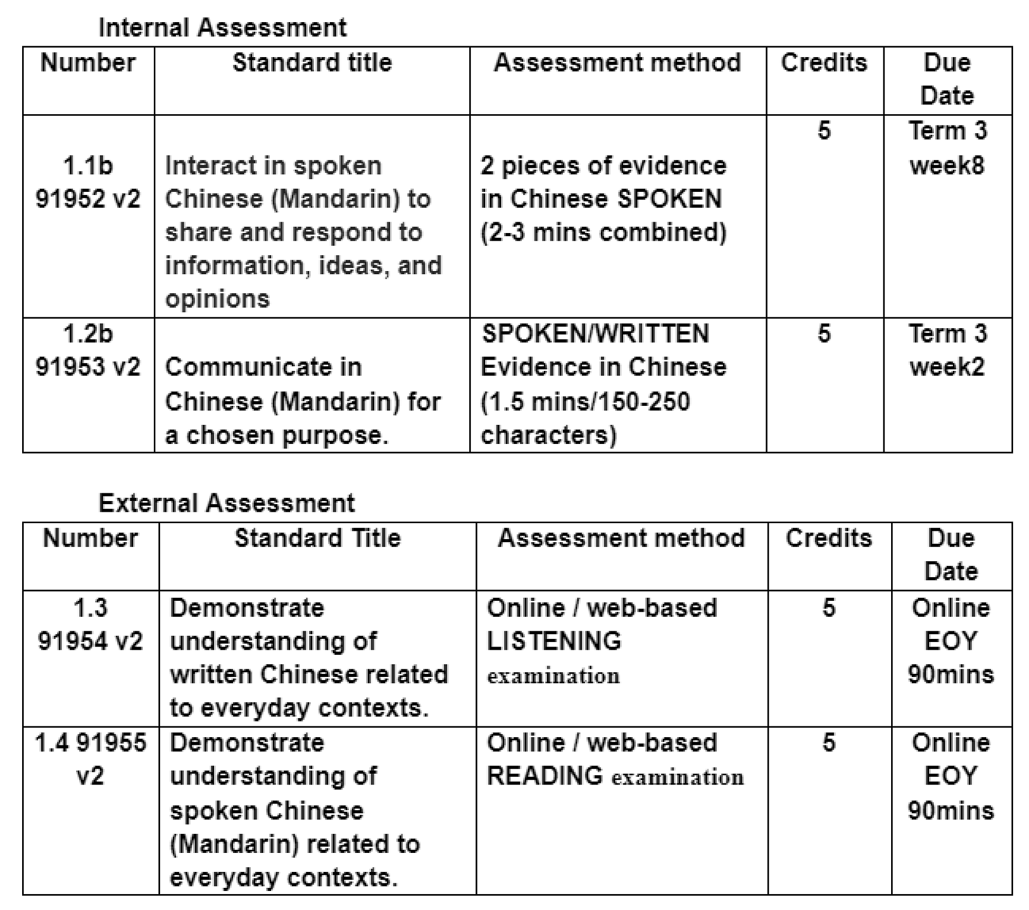 Year 11 Chinese course offers 20 credits towards the attainment of NCEA Level One. Course content is assessed both internally and externally throughout the year.