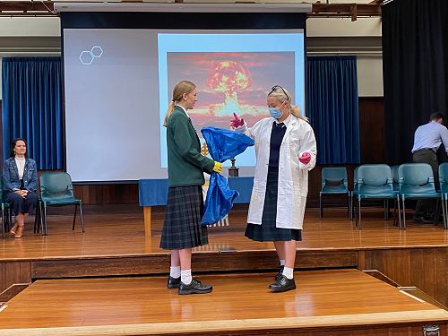 Head Prefect, Miss Hannah Coe, demonstrated superb acting skills, brandishing the sack with dramatic flair and heightening anticipation. Mr Chambers' cameo - in which he dashed onto the stage and insisted Kate wear appropriate safety equipment - added to the tension and further emphasised Mrs Duthie's point: that the way we use our tongues has the potential to either hurt or heal. We were asked to consider whether our words are used to criticise or praise, to destroy or unite, or to cause misery or bring comfort to others. It was certainly an inspiring way to start the year - with us each being asked to remember how easily we can impact others, and how even the smallest words can cause a ripple effect, whether for good or bad.