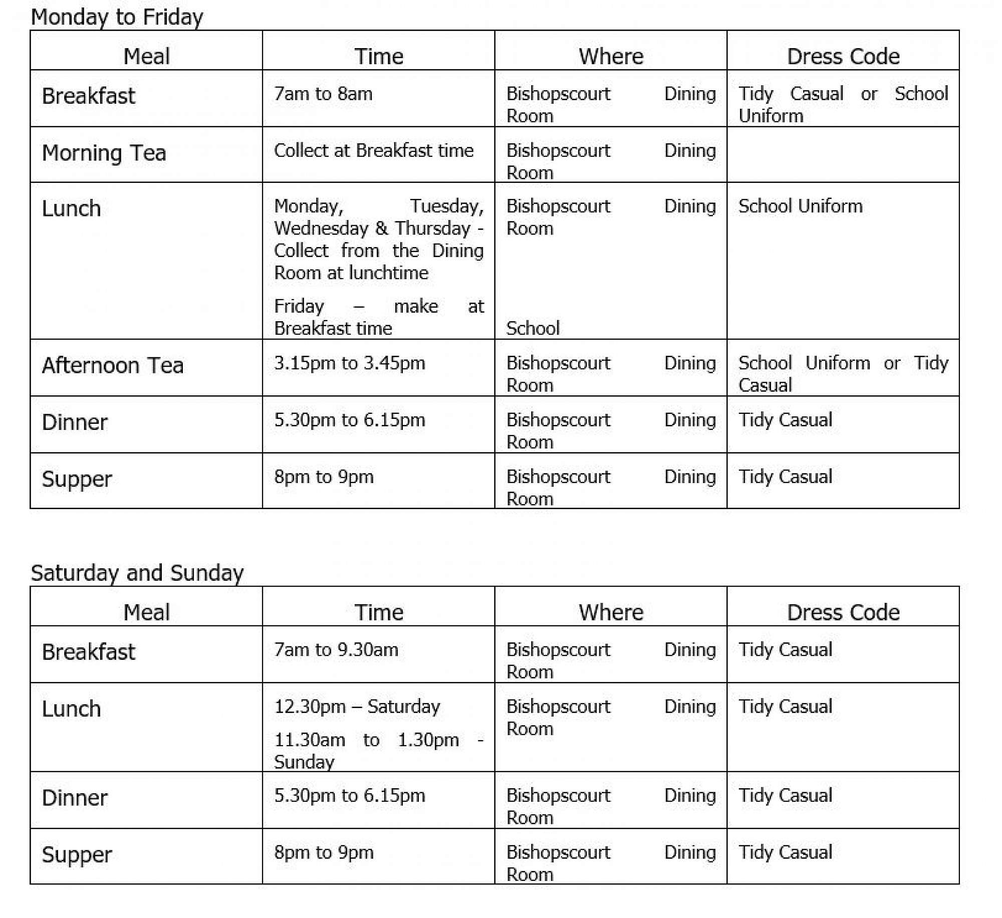 Boarders are expected to attend all meals except by prior arrangement with a supervisor.