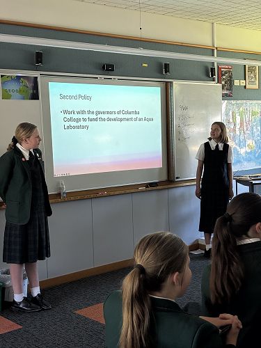 Each Year 9 class formed an electorate, with four to five parties vying for the party vote. Electoral candidates and their respective party leaders pitched two policies, one relating to Columba and one to the wider Dunedin area, all within a tight two-minute time period. There were a variety of policies brought forward, including a summer skort, a new timetable to allow for extra holidays, and introducing subjects like hard materials and food technology. The Dunedin hospital was another area of focus for the parties, in addition to revamping the city’s shopping district. Each class also had two electoral officers who organised the day, creating EasyVote cards and voting papers, in addition to making sure votes were cast privately and without influence.