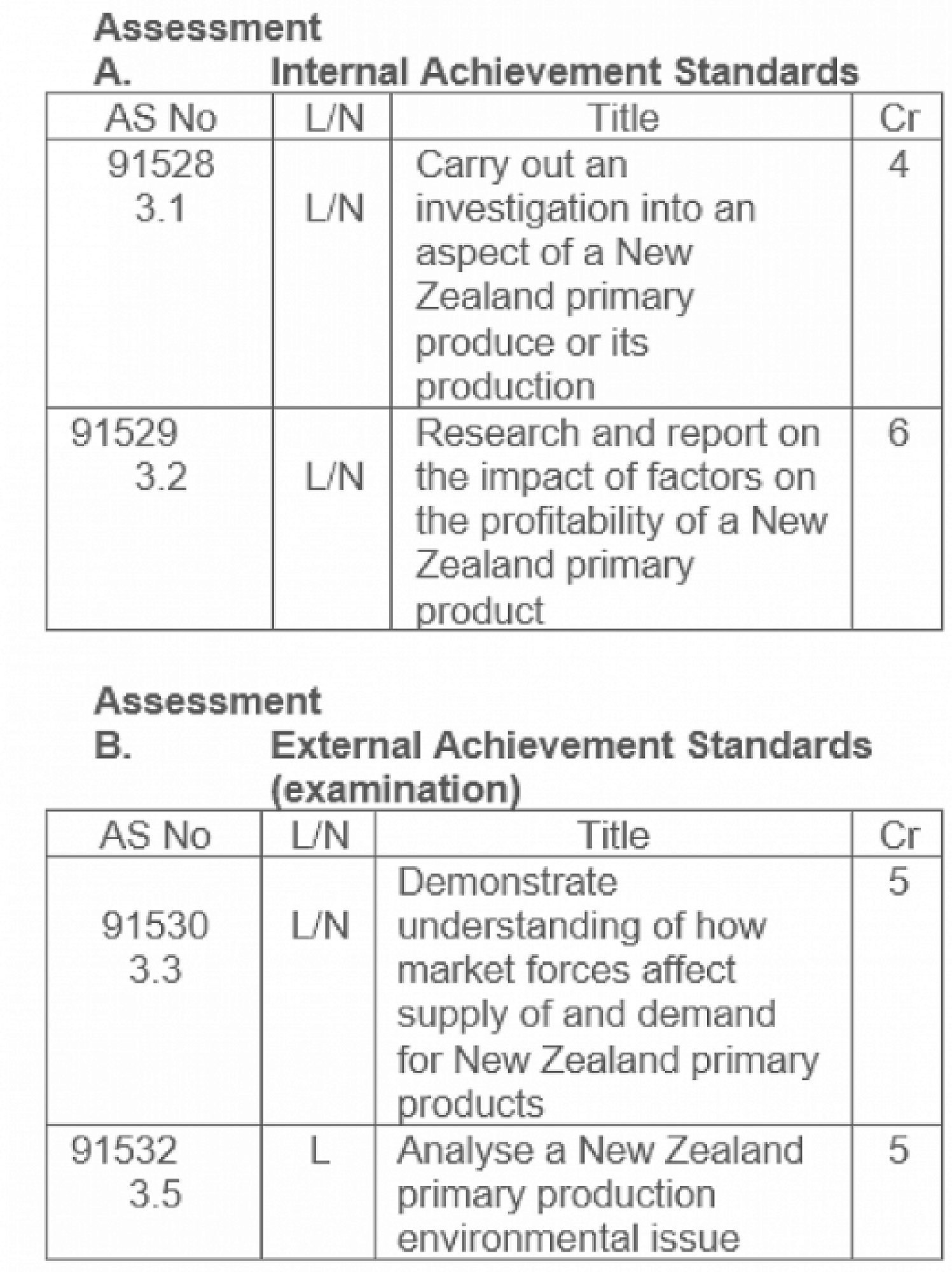 Four achievement standards, plus a selection of relevant unit standards chosen from Agribusiness Training at Level 3, including both theory and practical components: Quad Bike, Motorcycle and Small engines courses (total of 15 level three credits for Agribusiness courses)