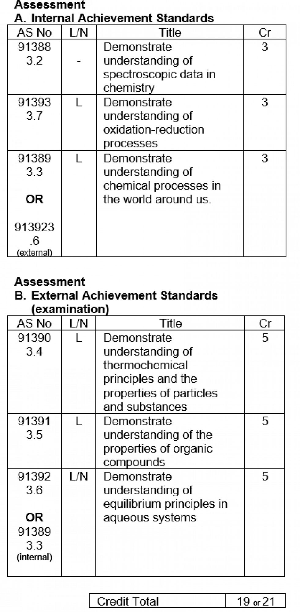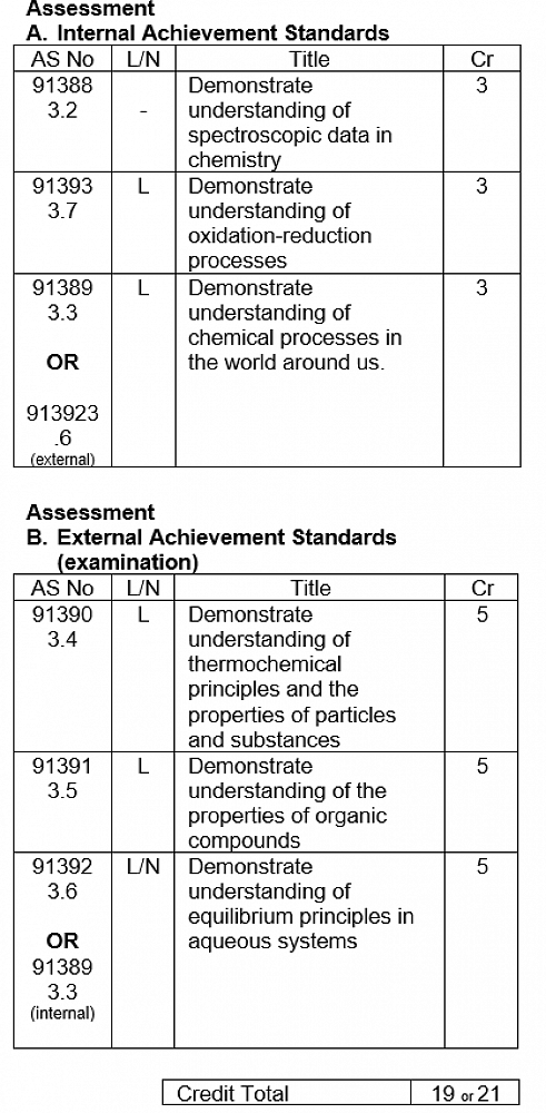 It is recommended that a student has passed at least two external standards at Level 2, preferably at a Merit or Excellence level because the Level 3 Chemistry externals are a harder version of Level 2 Chemistry externals. Alternatively, the student may discuss entry into the course with the HoD of Chemistry.