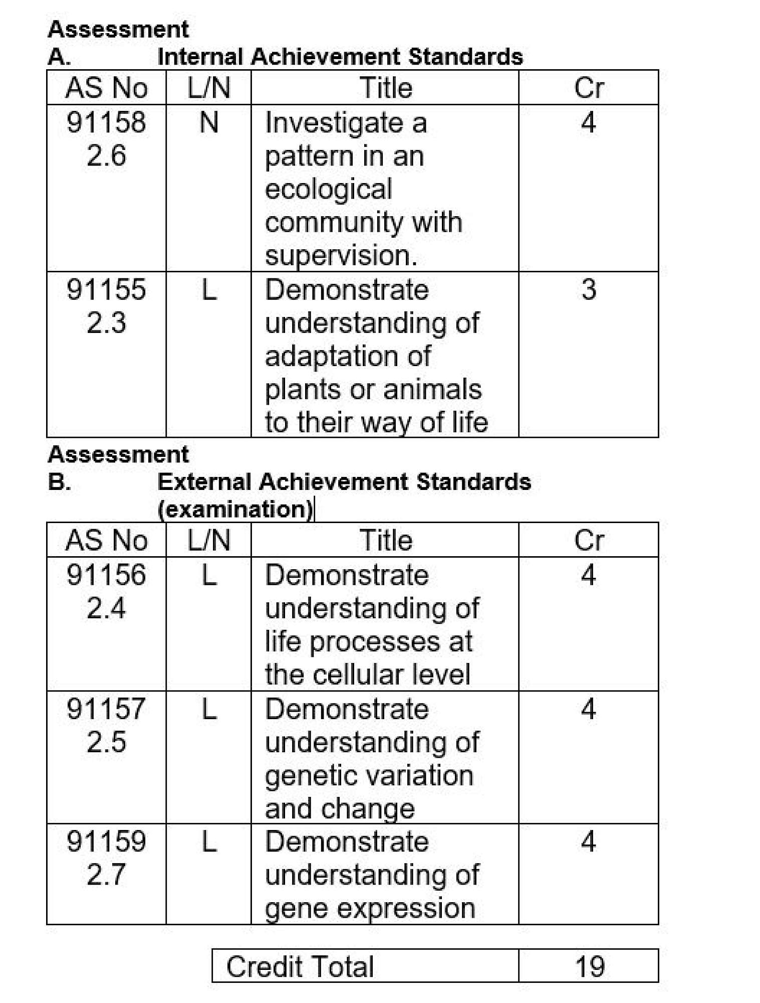 The external assessments test the students’ knowledge and ability to explain biological principles. A good command of the language of Biology is required to perform at Merit and Excellence levels in these examinations. Therefore, students will be expected to learn a significant amount of Biology vocabulary for each topic.