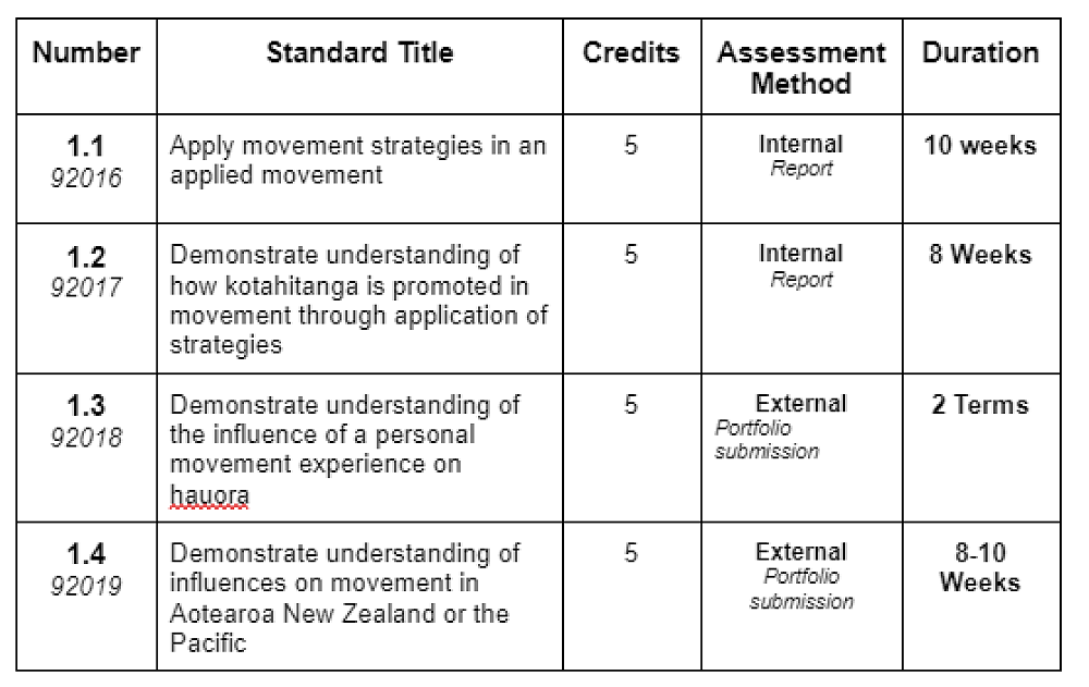Competitive and social activities, ki-o-rahi, volleyball, cross-fit, team games, yoga, anatomy, biomechanics, exercise physiology, psychology, skill acquisition, te ao Māori. Movement sessions, identifying energy systems, movement sequences, interpersonal skills, communication, exploring leadership, respect, working together, developing strategies as a group/team, adaptive physical activity.