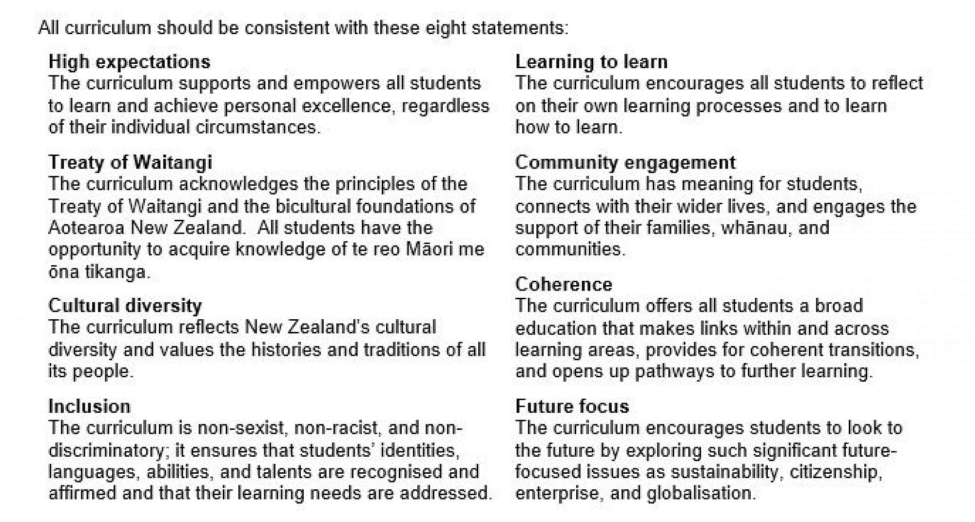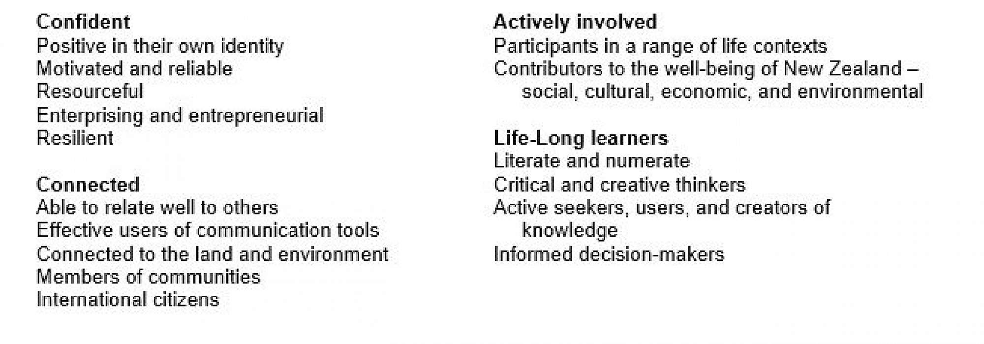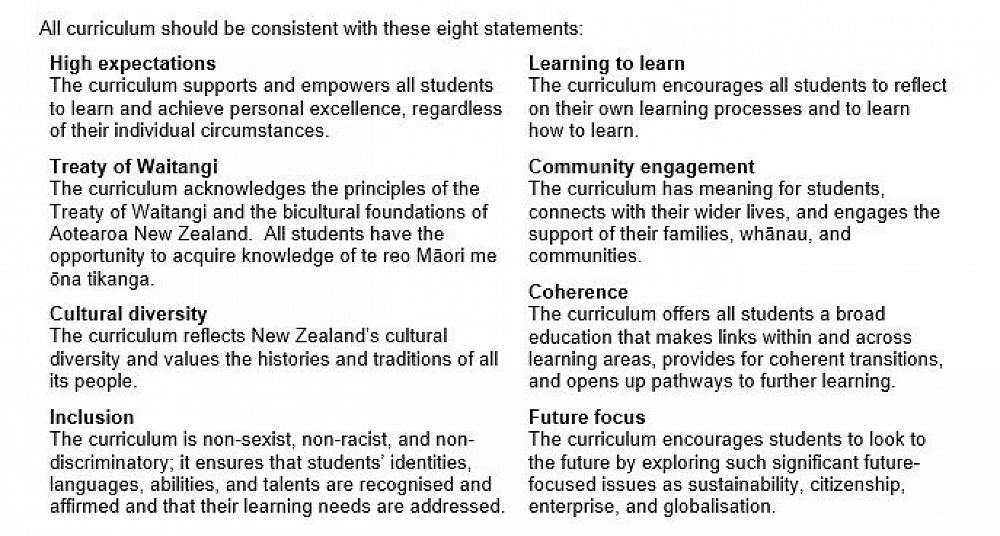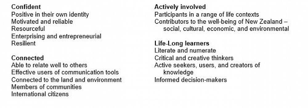 The New Zealand Curriculum is a clear statement of what we deem important in education. It takes as its starting point a vision of our young people as life-long learners who are confident and creative, connected, and actively involved It includes a clear set of principles on which to base curriculum decision-making. It sets out values that are to be encouraged, modelled, and explored. It defines five key competencies that are critical to sustained learning and effective participation in society and that underline the emphasis on life-long learning.