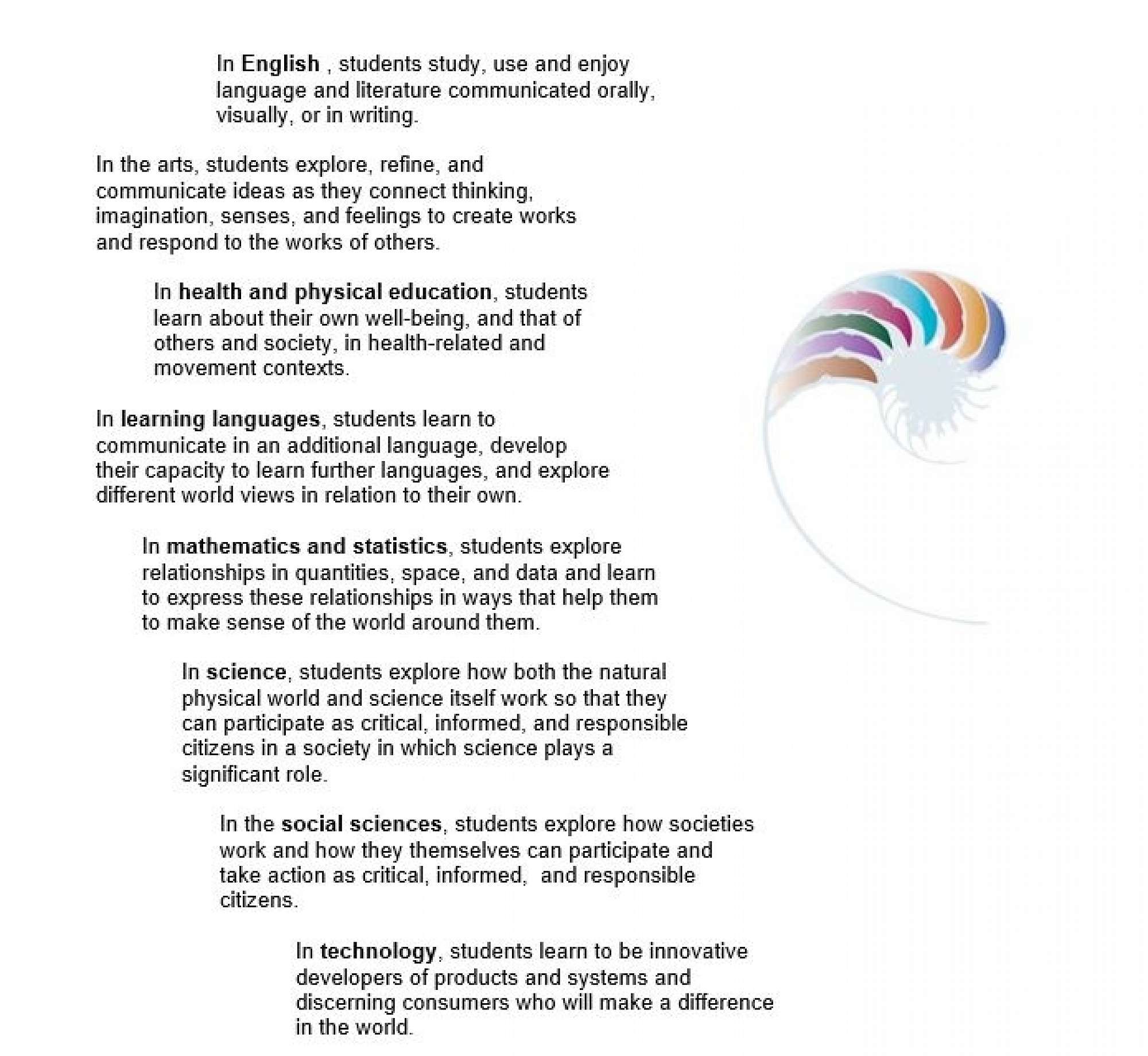 Each learning area has its own language or languages. As students discover how to use them, they find they are able to think in different ways, access new areas of knowledge, and see their world from new perspectives.