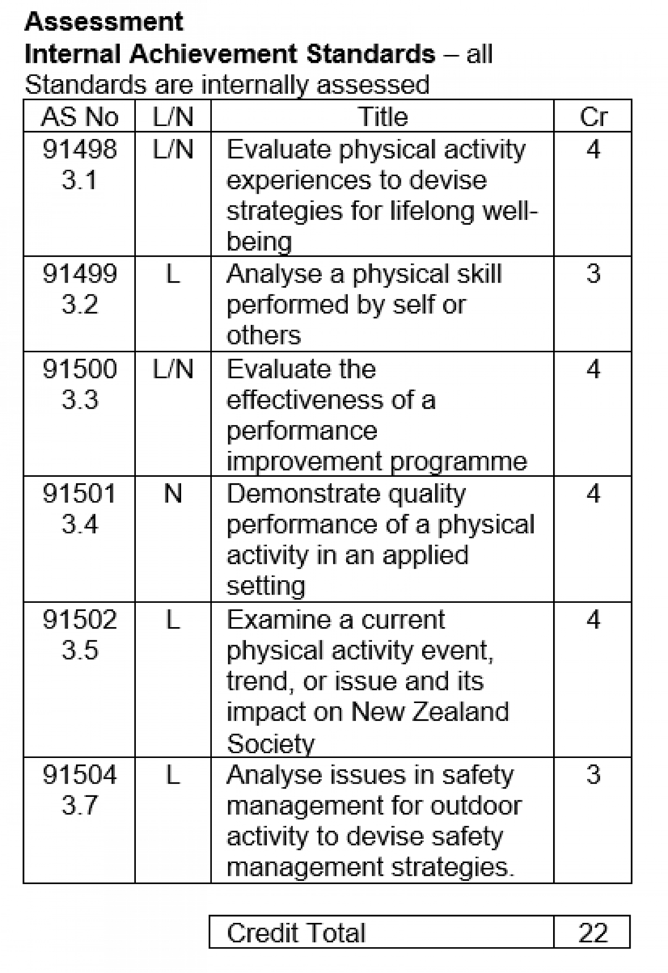 This course offers the opportunity to experience and participate in a wide range of physical activities, in a variety of contexts. Knowledge from Level 2 Physical Education will be built on and applied to a variety of situations. A high level of critical inquiry is required for most achievement standards and evaluations relating to socio-cultural aspects are required for most standards.