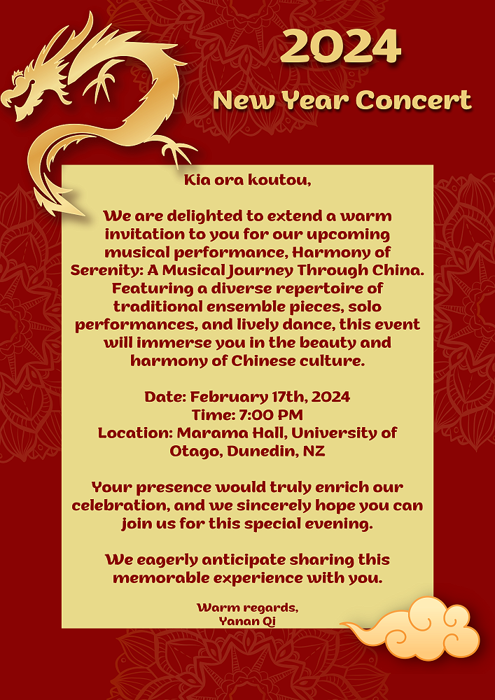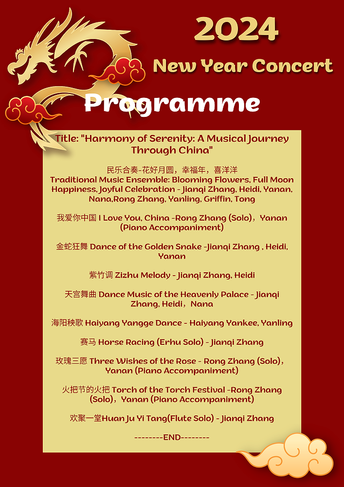 Chinese New Year Concert Ms I Ding — February 14th, 2024 Saturday 17th February, 7pm Please see the invitation and programme below for more details: Invitation — Image by: Dawn Hope Programme