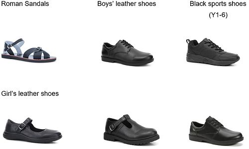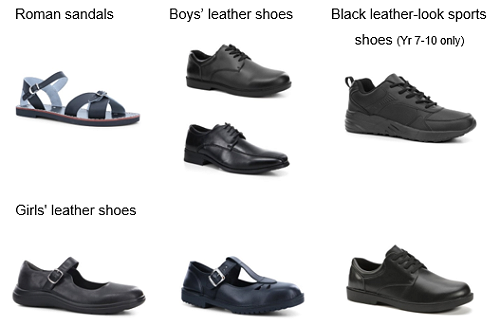Y11-13: Plain black leather lace-up shoes, or black leather buckle shoes (girls) with regulation navy socks or navy opaque tights. The plain black sport shoe option is not available for Year 11-13 students.