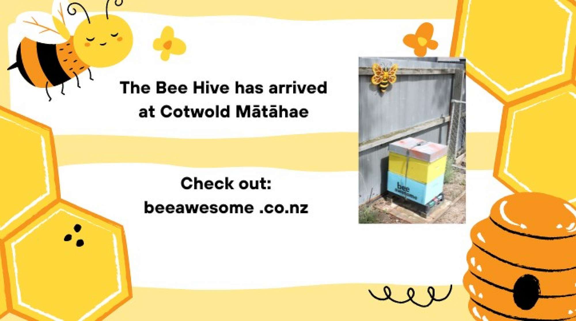 During the summer holidays Cotswold Mātāhae received their bee hive. The bee hive is located behind the Senior teaching block behind Room 22 and 23.
