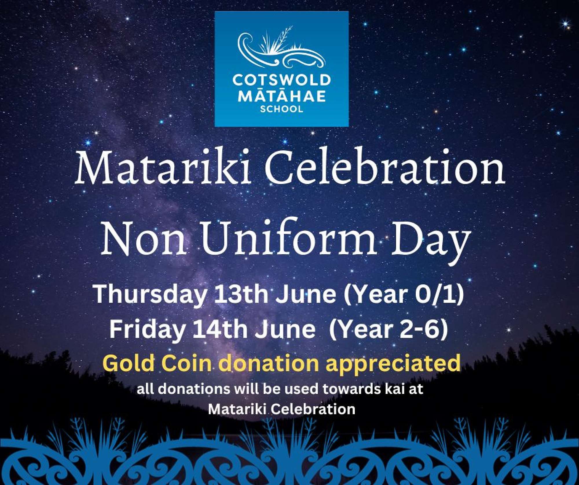 We will be holding two Non Uniform Days next week to raise funds to provide kai to our school community at our upcoming Matariki Community Celebration.