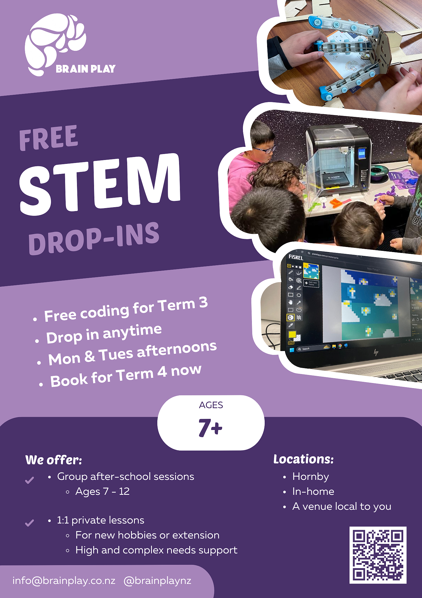 Brain Play has landed in Christchurch & will be running free coding club trials for all of September to show off our STEM activities & meet our new local community. We offer after-school group sessions, and in-home 1:1 sessions. To meet our team & learn some coding, please register for a local event through our website: www.brainplay.co.nz/events-and-holidays or email us on info@brainplay.co.nz.