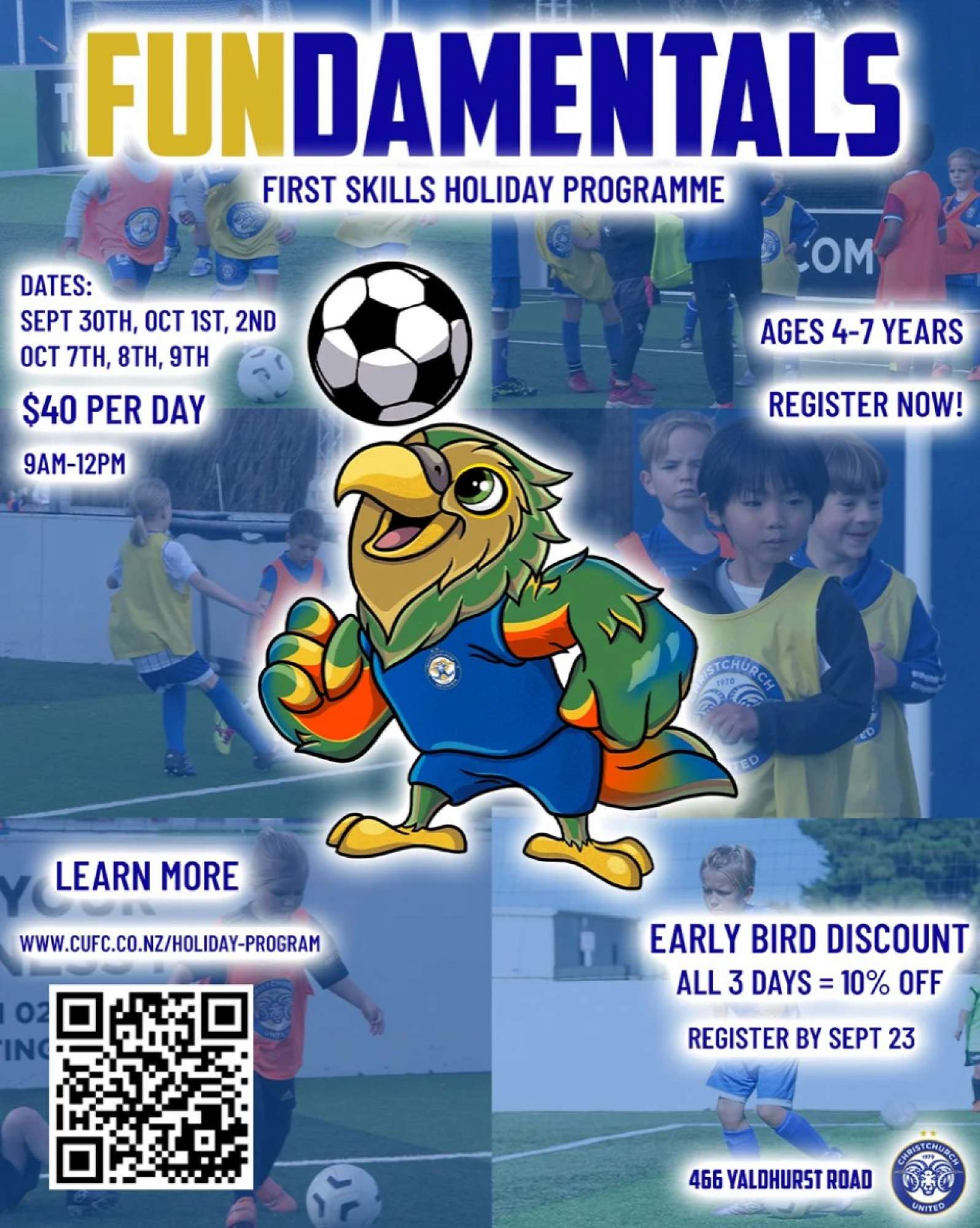 Christchurch United FC, one of the most historic clubs in New Zealand, will be hosting several weeks of football camps over the upcoming Holiday Break at the United Sports Centre designed for young children (ages 4-13).