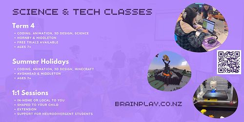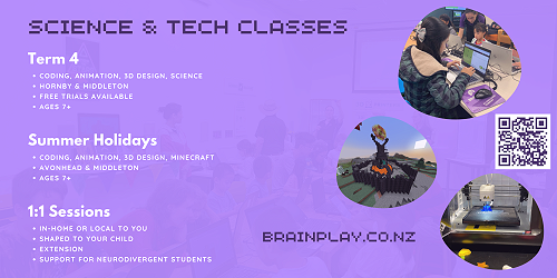 Brain Play is running unmissable STEM activities for children all summer long. Students aged 7+ can join our friendly team for coding, animation, 3D design, and Minecraft experiences! Find us after-school and during school holidays in Hornby, Avonhead, and Middleton + more locations coming soon. We travel to your home for 1:1 sessions too! Free trials are available. Check out: https://www.brainplay.co.nz/ to read more about our workshops. New students are always welcome, and neurodiverse specific classes are available.