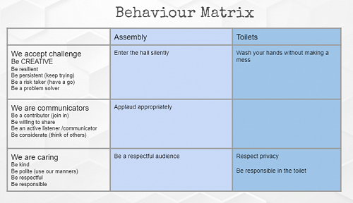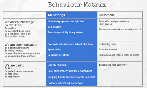 Each week children engage in lessons modelled on the Expected Behaviour Matrix. These lessons help to develop their understanding and ability to demonstrate the desired behaviours on a daily basis.