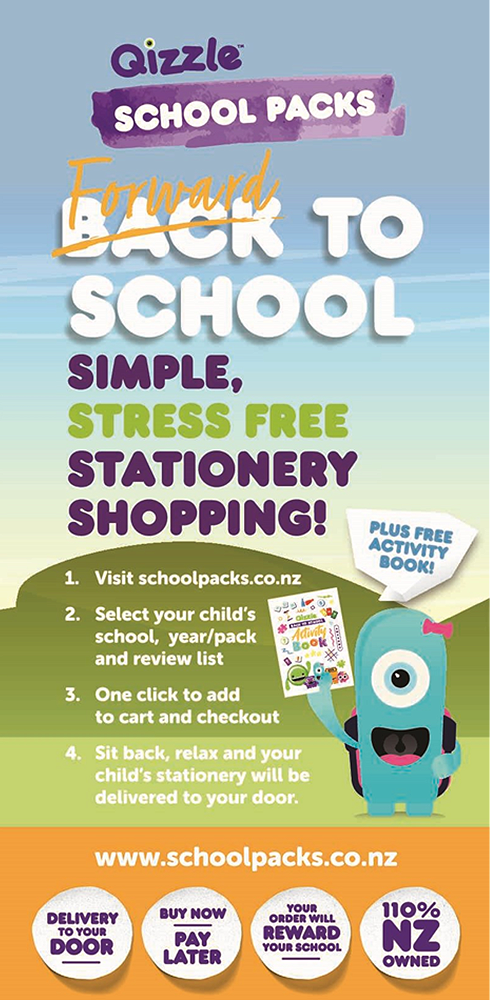 Student Stationery can be purchased online from Qizzle – www.schoolpacks.co.nz Stationery ordered from Qizzle is delivered to your home. This link will also give you access to stationery lists should you wish to purchase stationery from another source.