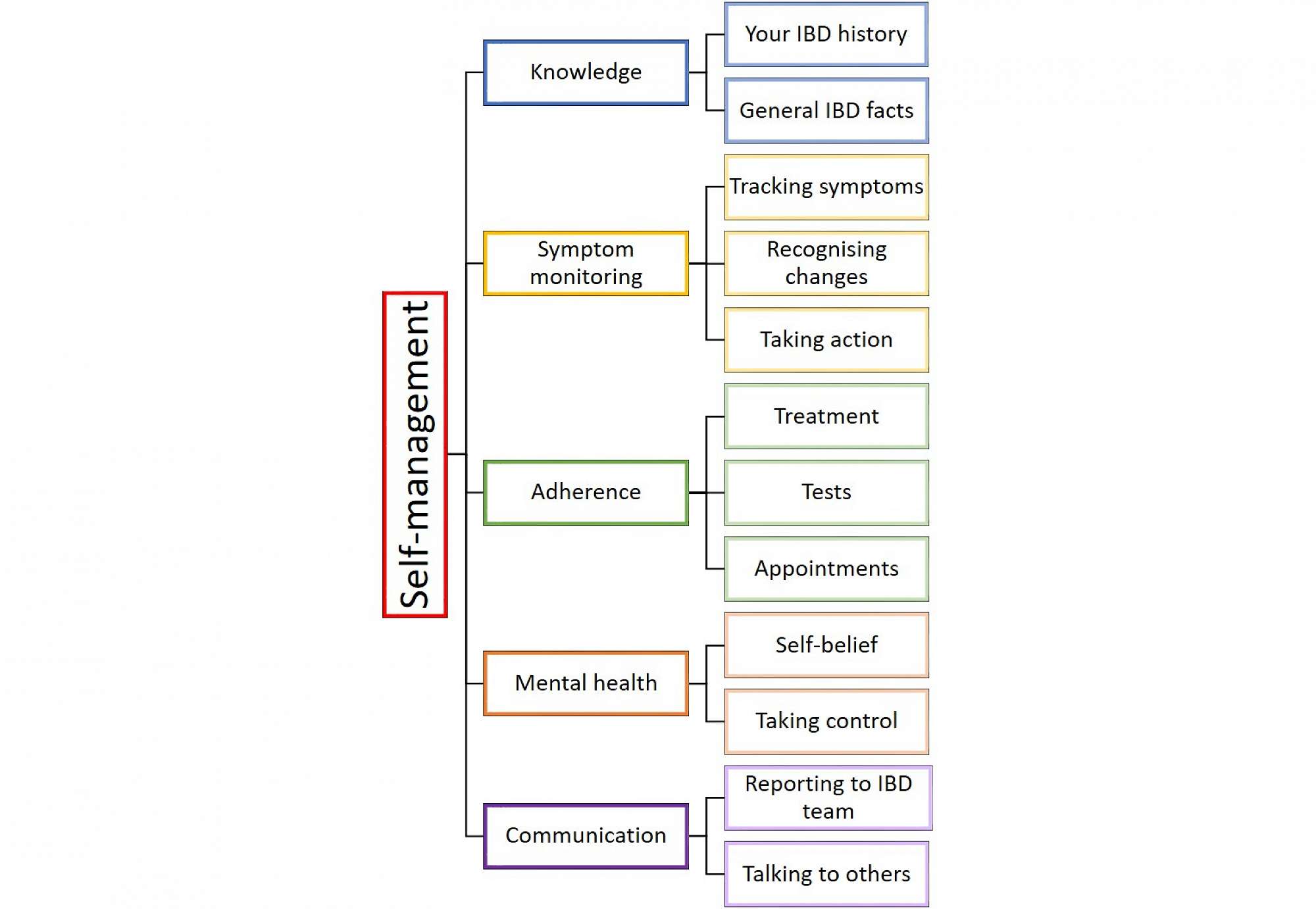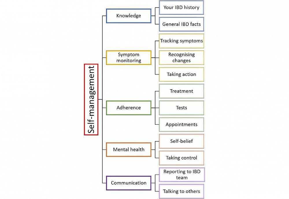 There are five main parts to self-management: Knowledge, Symptom monitoring, Adherence, Thinking, and Communication (see Figure 1). By gaining skills in these areas, people can better self-manage their IBD, which will in turn benefit their outcomes.
