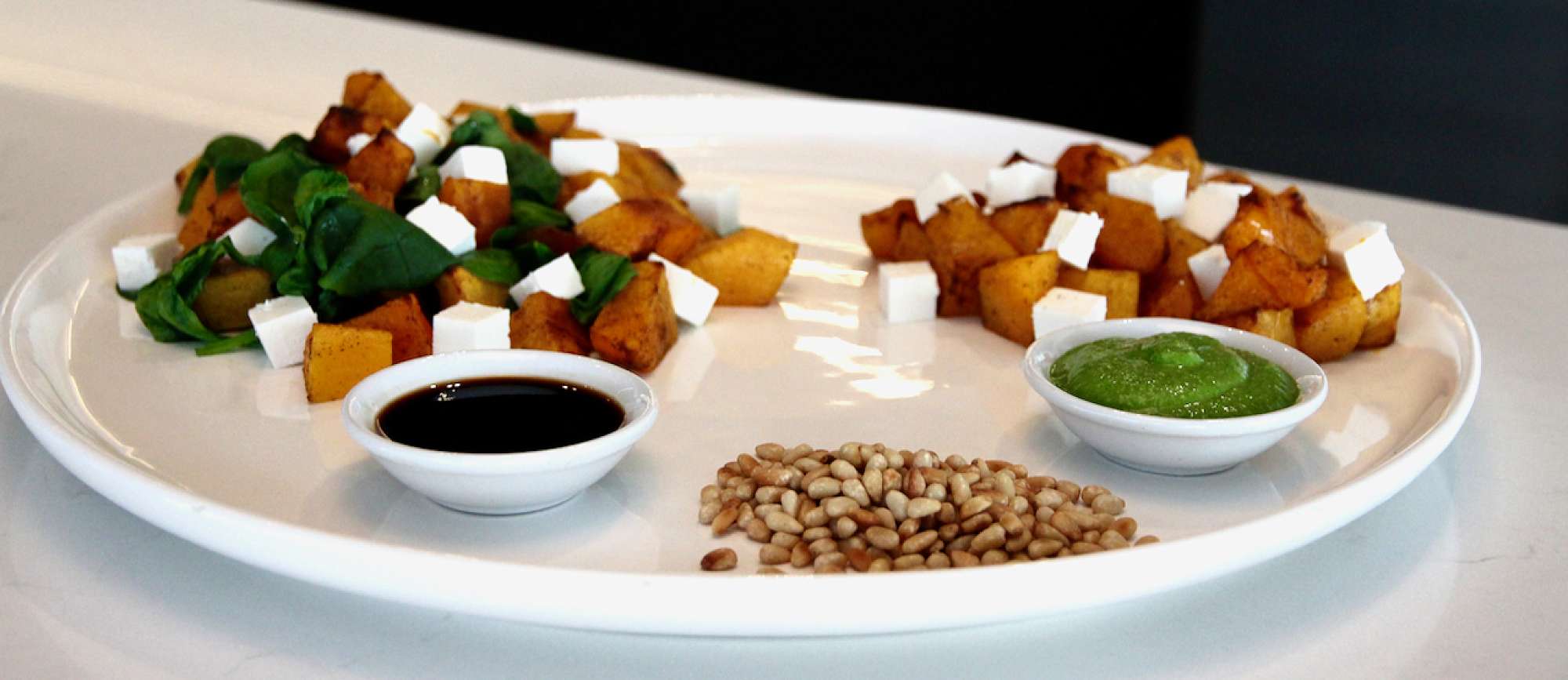 3. Once pumpkin is cooked scattered spinach over pumpkin and return to the oven to wilt the spinach (2 -3 minutes). Remove from the oven, toss to combine and leave to cool. Cut feta cheese into 0.5cm cubes. Once pumpkin is cool, drizzle over balsamic vinegar and transfer to a serving dish. Mix feta through the pumpkin and spinach and scatter with pine nuts. Delicious!