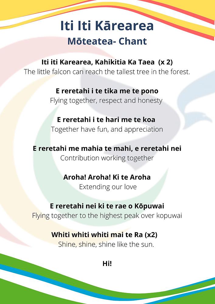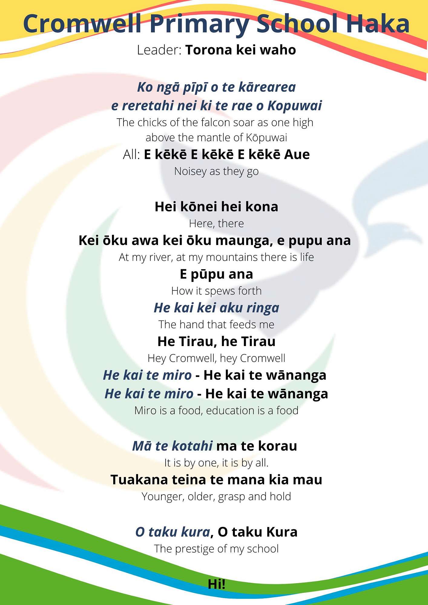 Attached are two posters with the lyrics to our Mōteatea (chant) and Haka. These are taonga (treasured items), belonging to the school which all children and staff learn. We encourage children to practice this at home and perhaps you could learn it too!